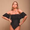 A calça modelo pantalona possui elástico na cintura e tecido leve.