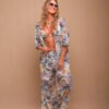 Calça modelo pantalona possui elástico na cintura e tecido leve.